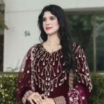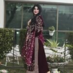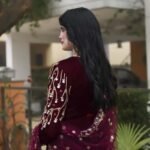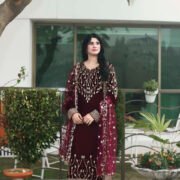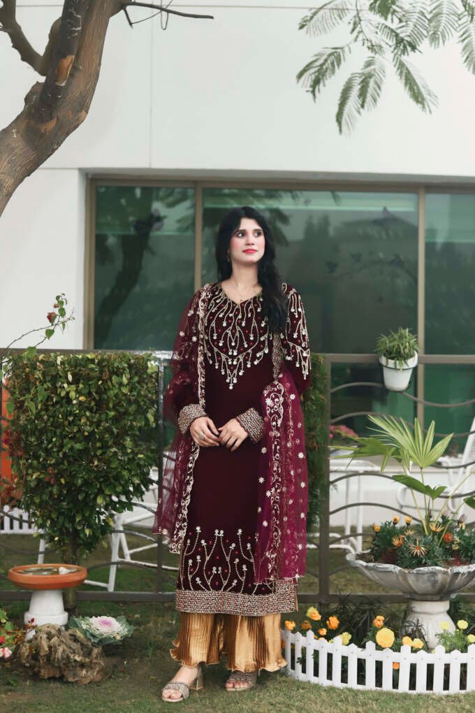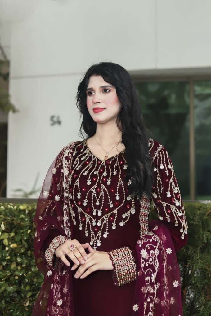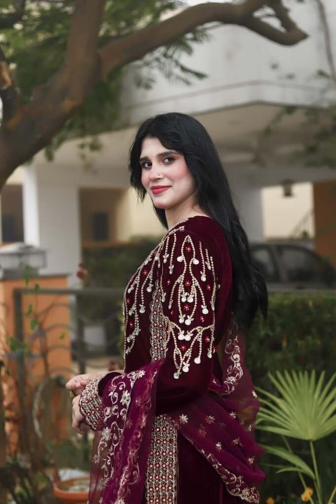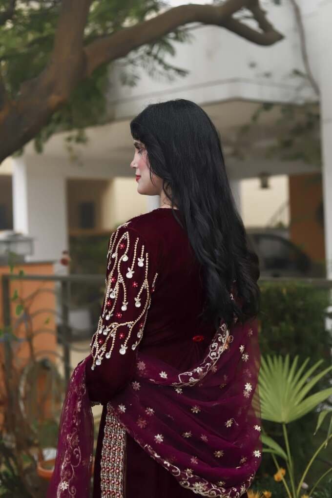 A regal deep maroon ensemble adorned with intricate hand embellishments and paired with a delicately embroidered dupatta and golden crush trousers for a luxurious festive look.