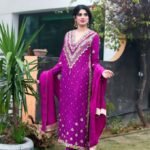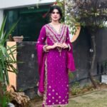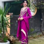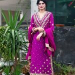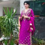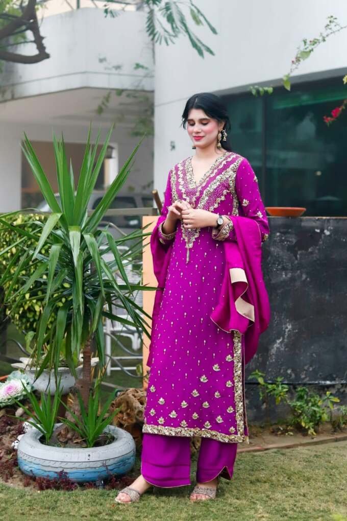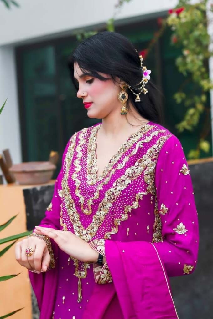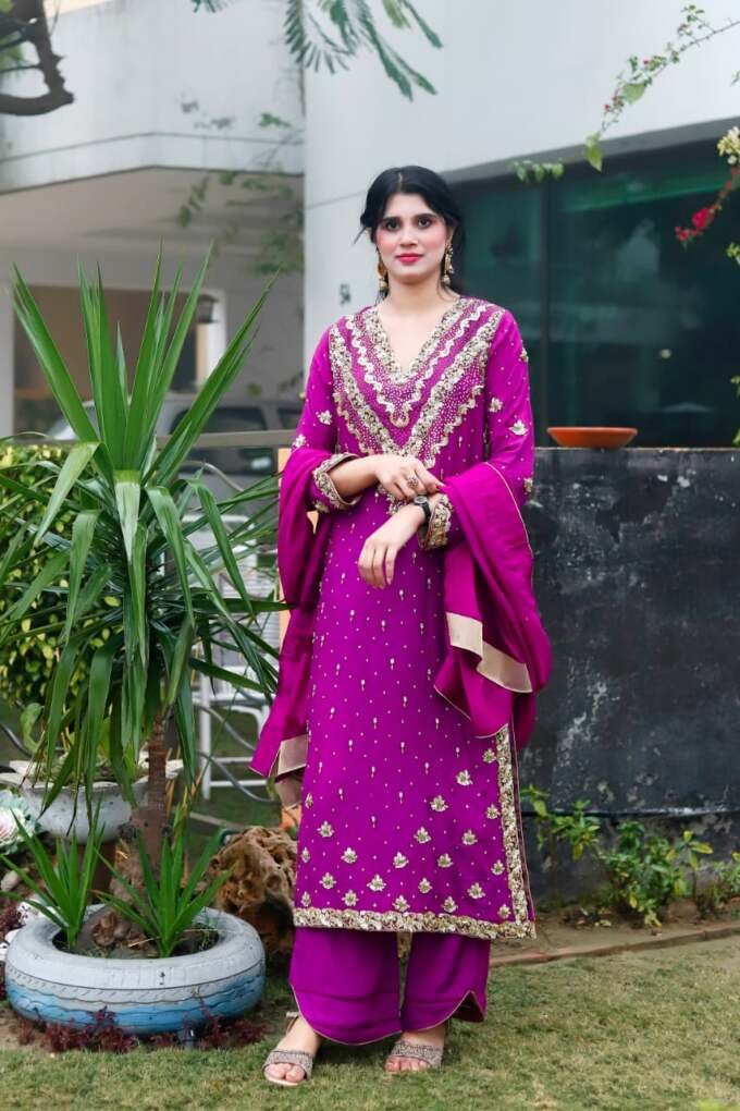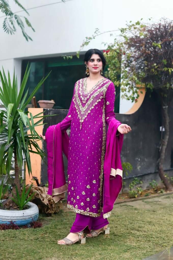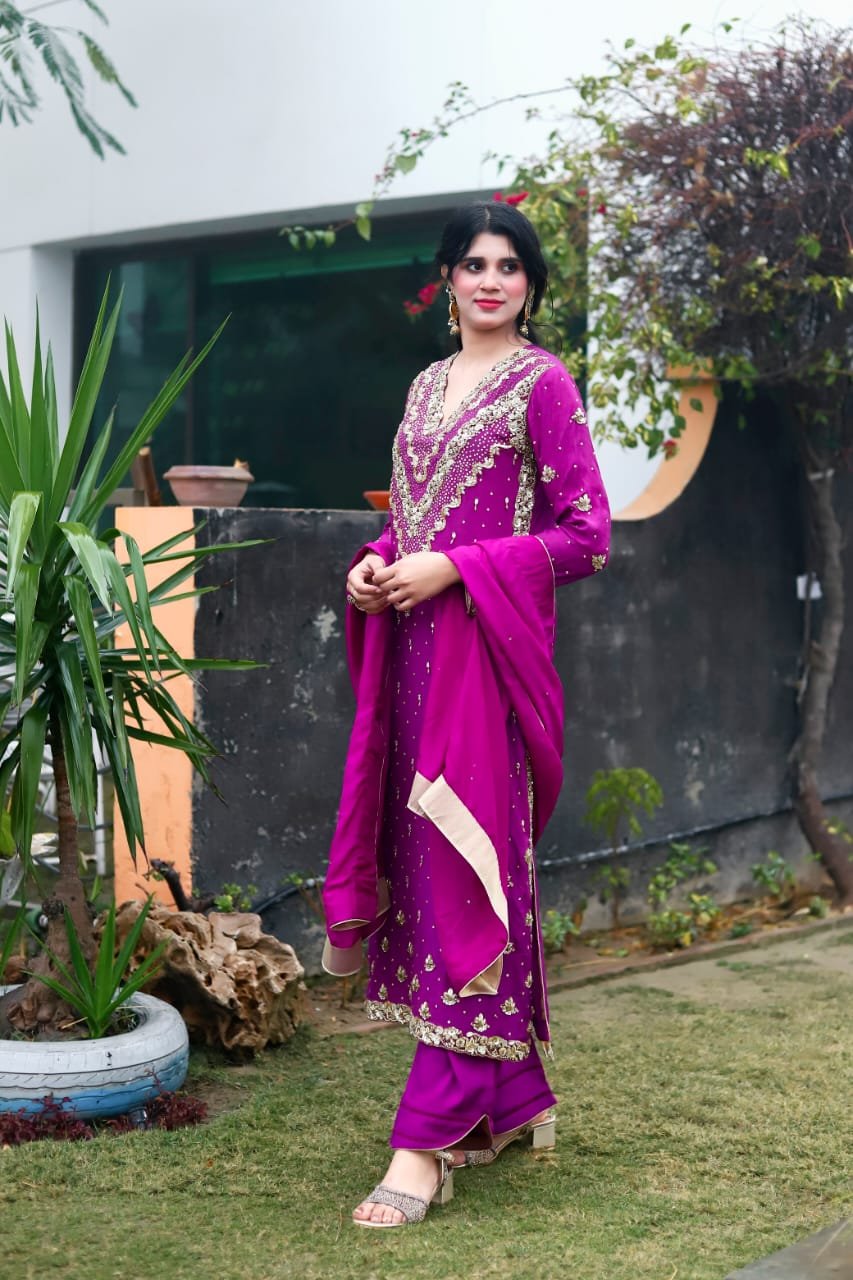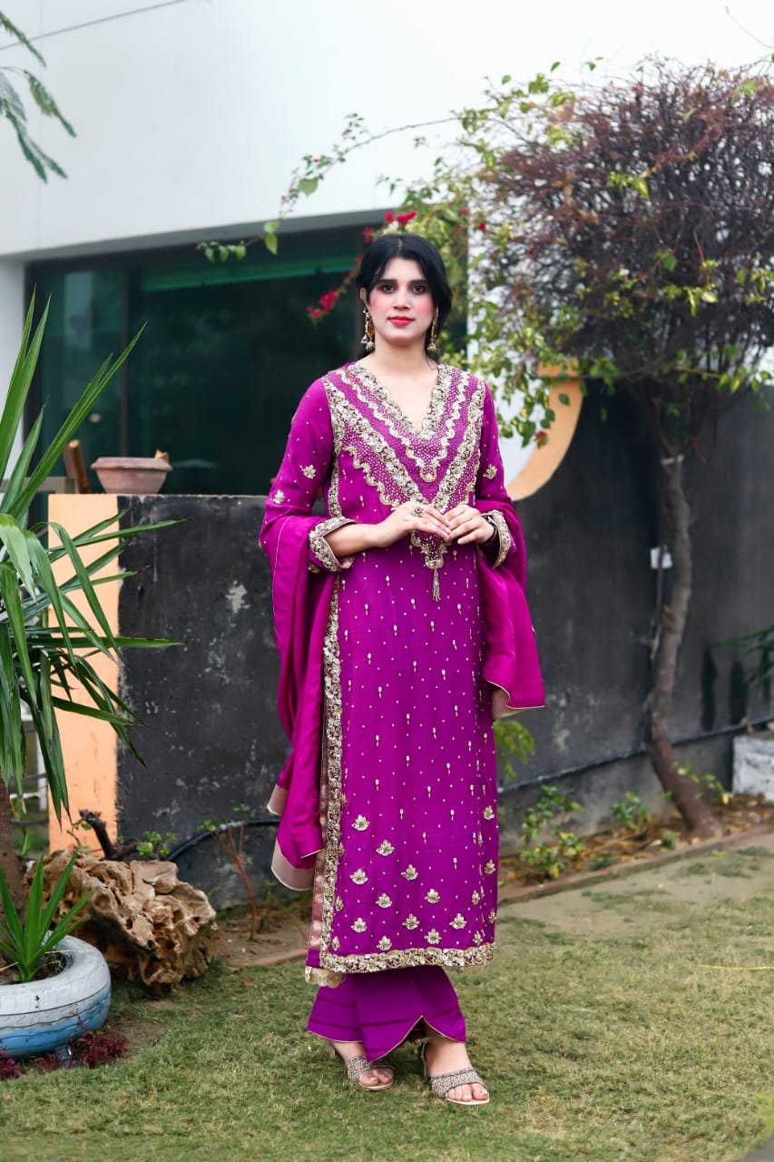 A regal magenta silk ensemble adorned with intricate golden crystal and dubka work , delicate hand embellishments, paired with a matching dupatta and cut designe trousers for a timeless festive look.