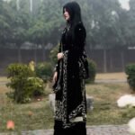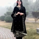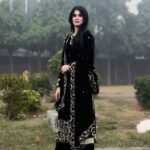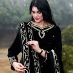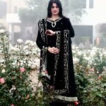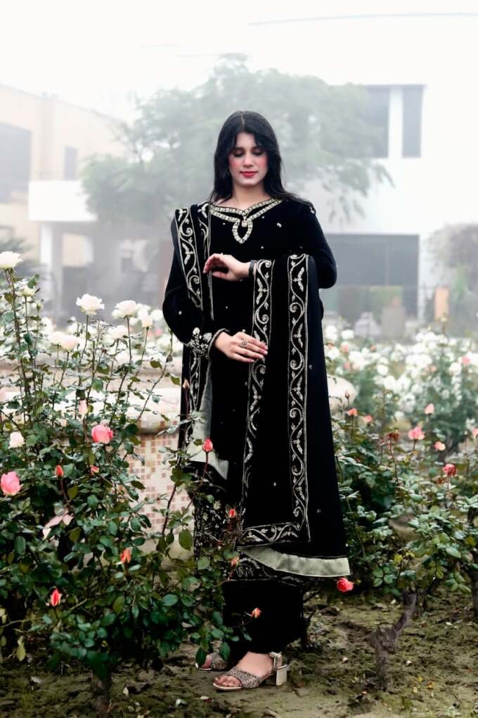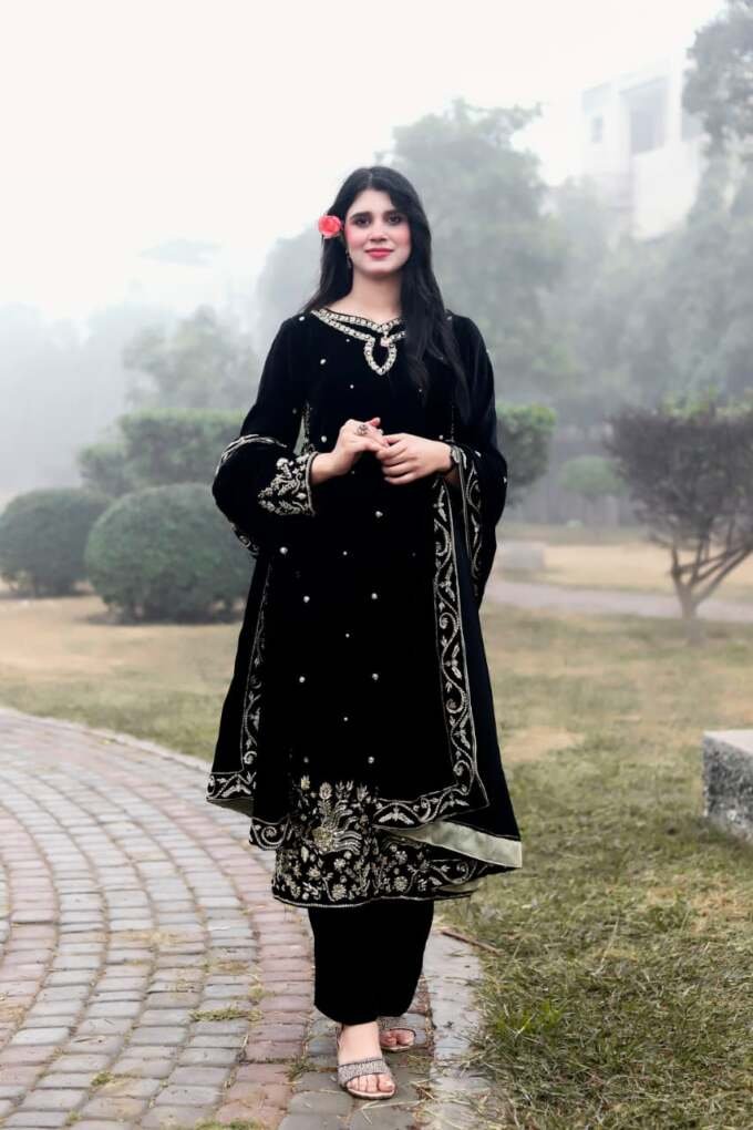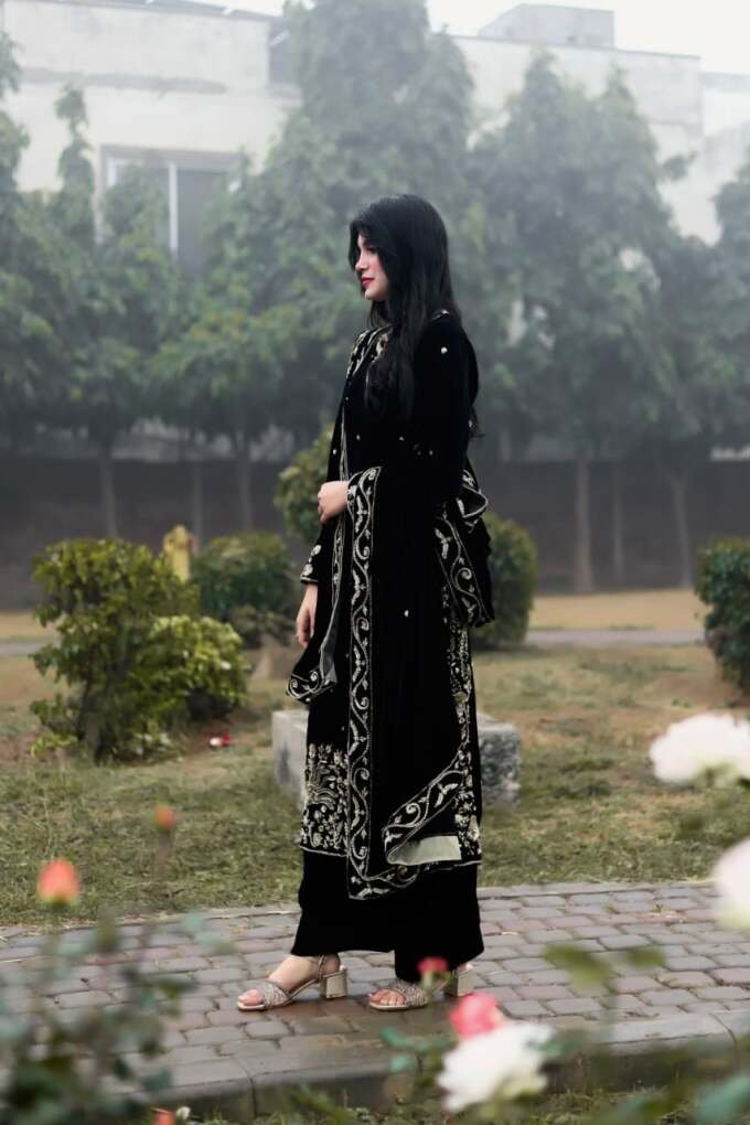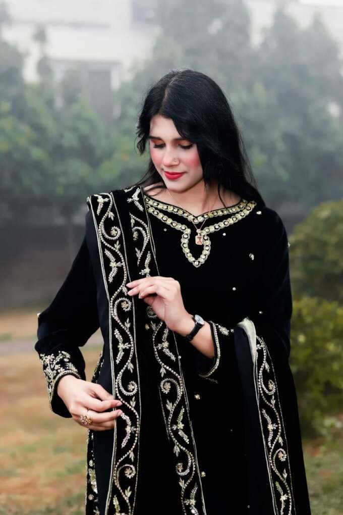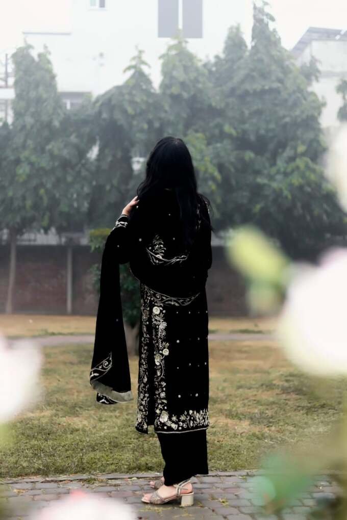 A graceful black outfit featuring delicate embellishments and a beautifully detailed dupatta for a timeless, elegant look.The pure velvet shirt features a scalloped border and hand embellishments in sequins, pearls, dabka, crystals and kingri. Paired with a velvet shawl four sided hand work embellishment creating a refined and graceful appearance.